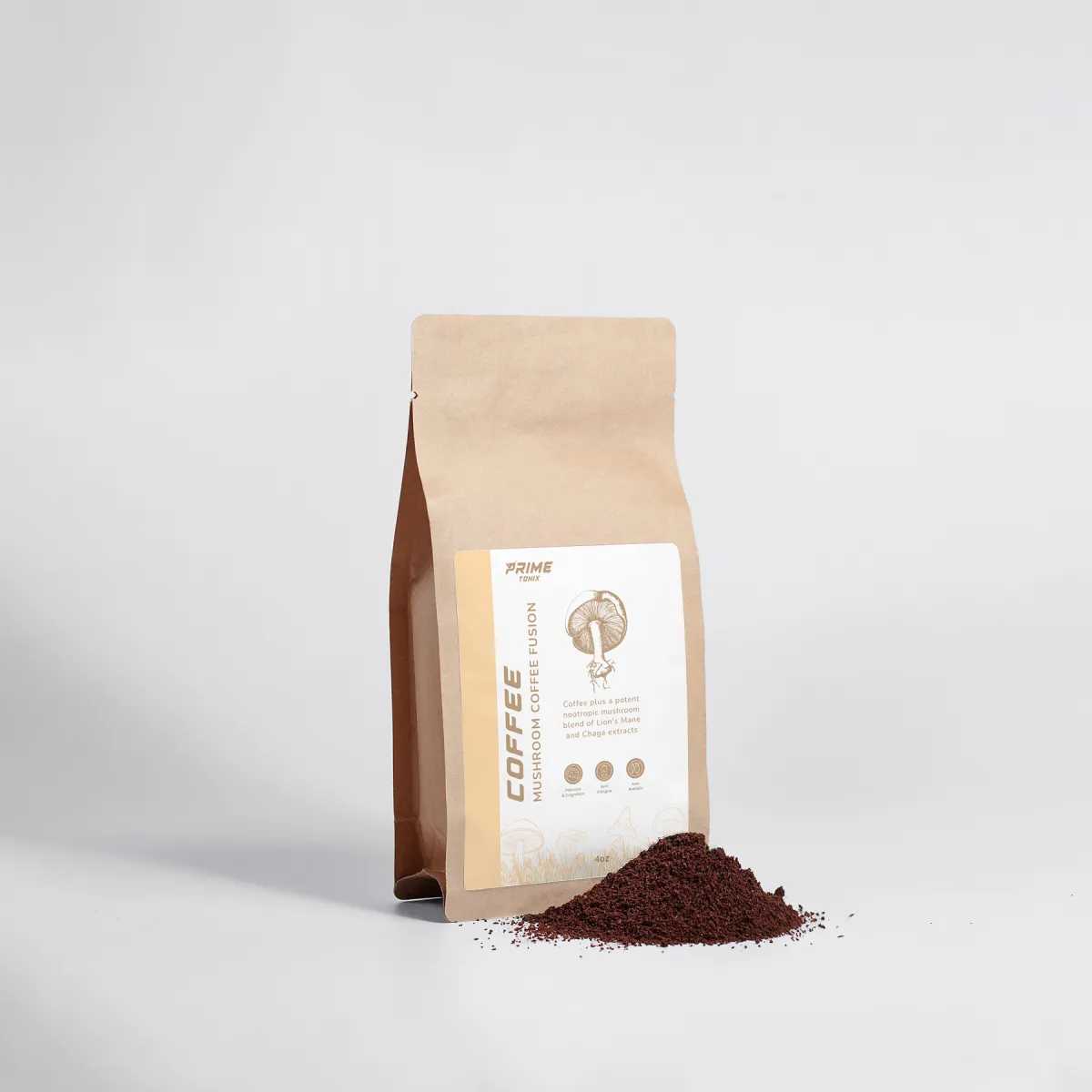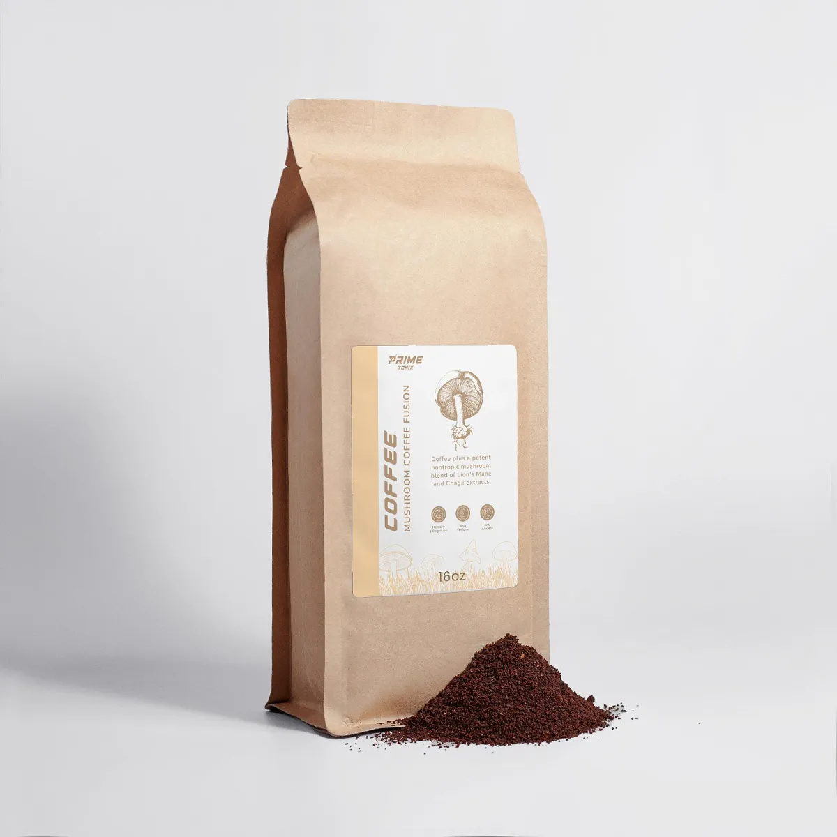 Coffee plus a potent nootropic mushroom blend of Lion's Mane and Chaga extracts
